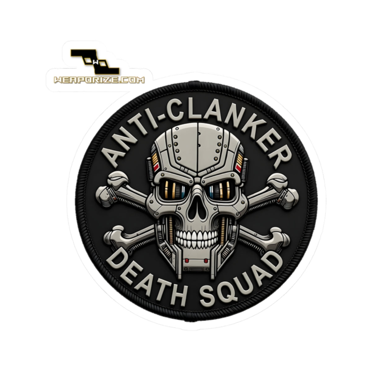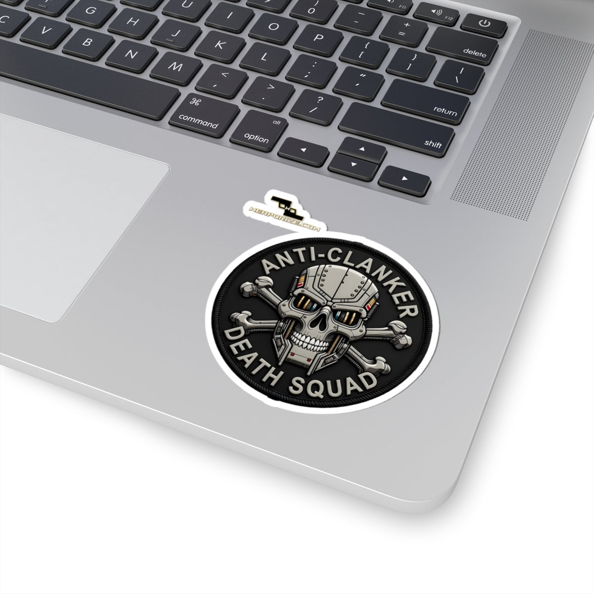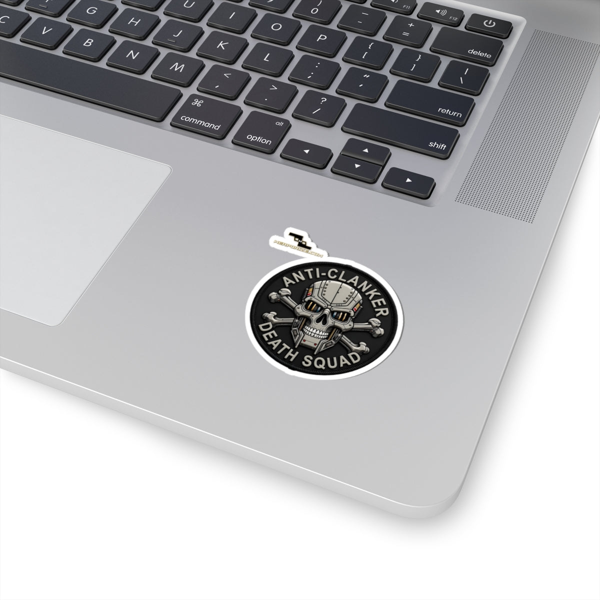 This glossy kiss-cut sticker reads “Anti-Clanker Death Squad” with bold, high-contrast ink that snaps against the surface it’s applied to. It’s got an attitude — a little dark, a little defiant — that sticks to laptops, journals, skate decks, and water-bottle sleeves (indoors). The vinyl’s durable feel and vibrant eco-solvent inks make the artwork pop, while the glossy finish catches light and highlights every line. Application is fast and smooth: peel, place, and press for a bubble-free result. Comes in white or transparent backgrounds and multiple sizes so you can layer it into a collection or let it stand alone as a statement piece. Note: for adult audiences and intended for indoor use only.