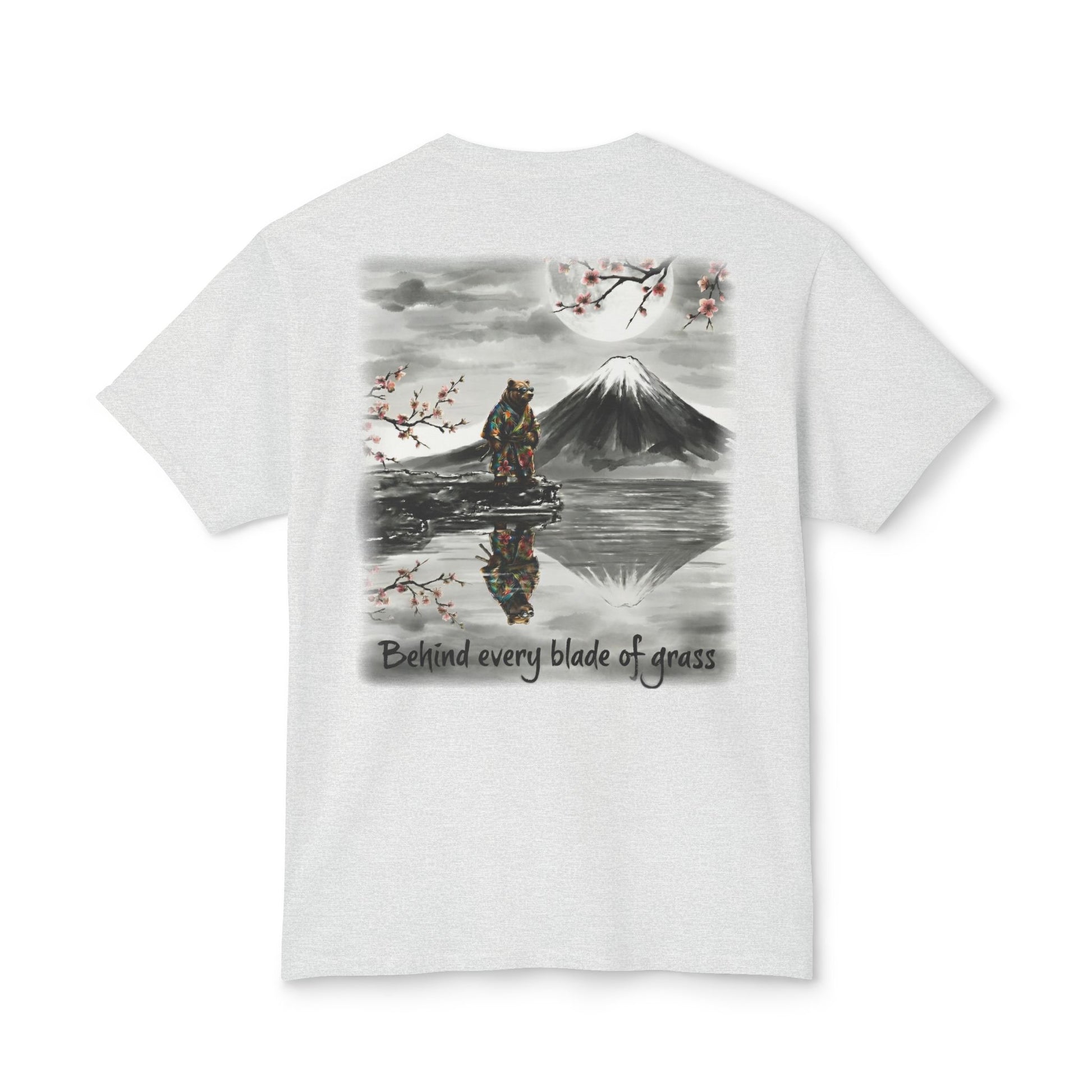 A soft, sturdy cotton tee that feels lived-in from the first wear. This classic crew shirt carries a quiet, painterly back print: misty mountains, a solitary pine, and a reflective lake beneath a pale moon — and a metaphorical quote about what we like to project.. an image that invites calm and slow afternoons watching the situation.
